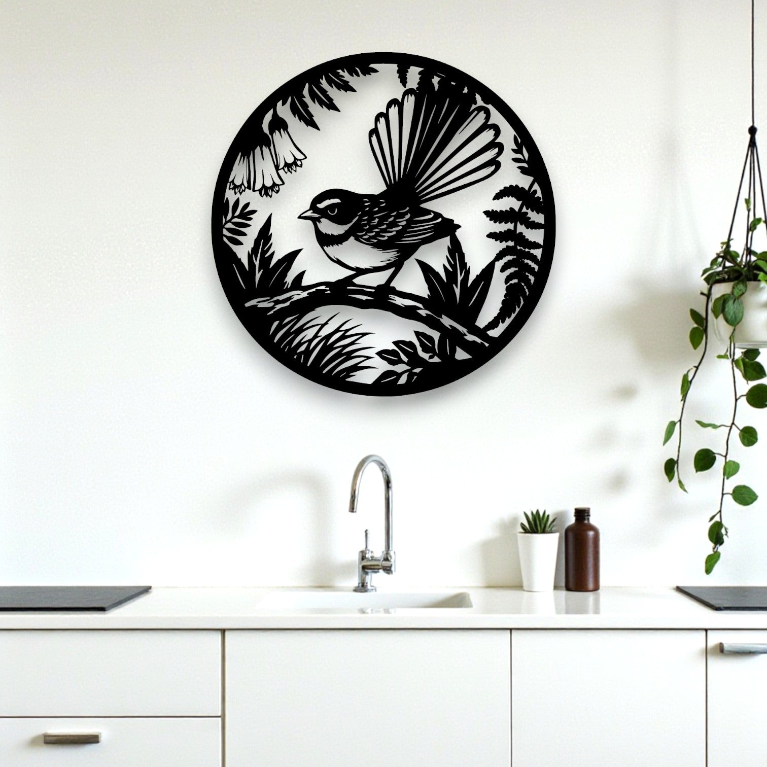 This detailed circular design features the playful fantail (Pīwakawaka) perched among delicate foliage. Known for their distinctive fan-shaped tail and curious nature, fantails are a familiar sight throughout Aotearoa, often fluttering through gardens and bush as they catch insects on the wing.