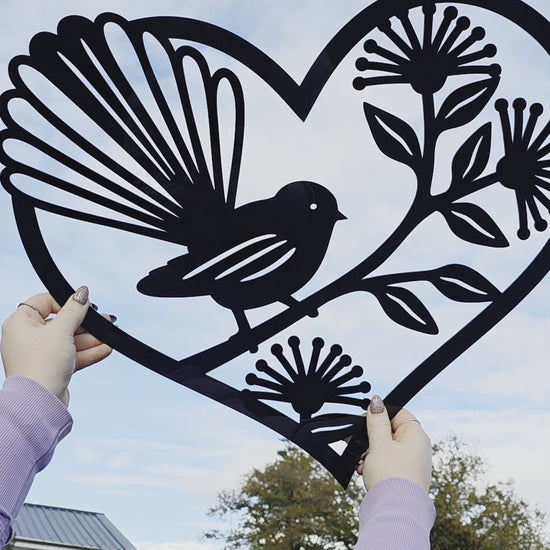 Celebrate one of our beautiful native birds with this unique fantail heart wall decor, filled with our stunning flora.